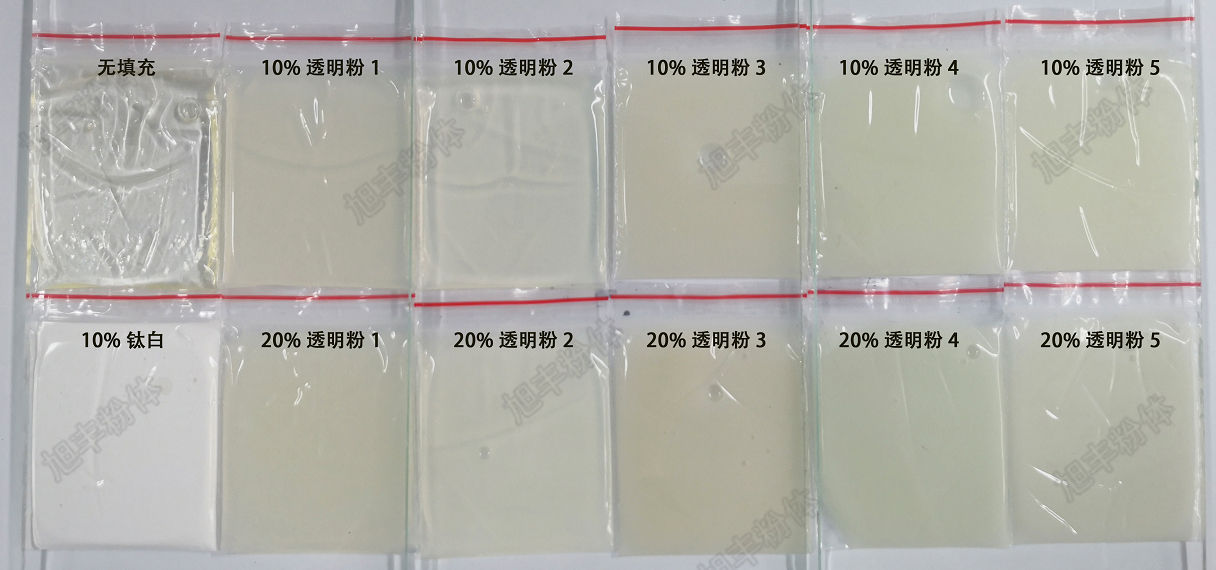 注:透明粉1、透明粉2屬于藍相,在黃光下拍照顯現的透明性稍差于透明粉3、透明粉4、透明粉5這類黃相填料。