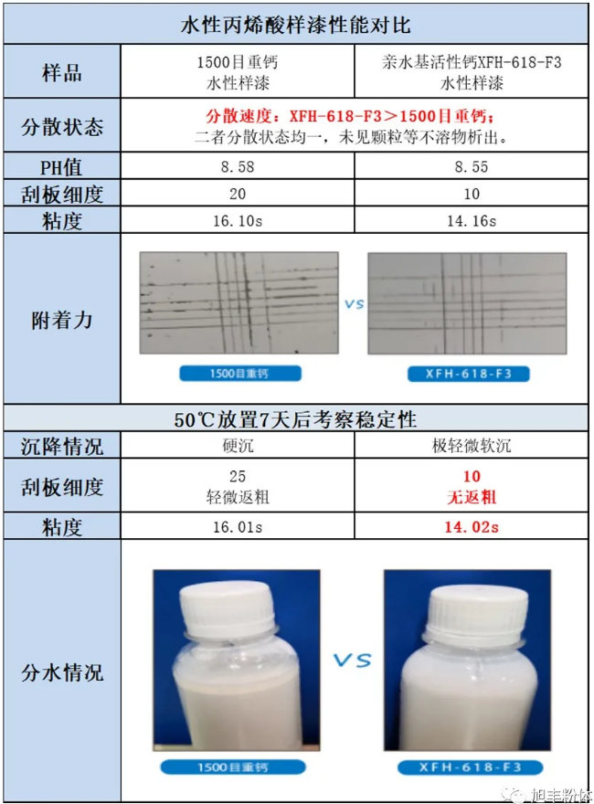 對比可知:親水基活性鈣XFH-618-F3比普通1500目重鈣潤濕速度快、分散效果好,附著力及儲存穩定性提高。更多應用信息或獲取樣品請來電咨詢,旭豐粉體竭誠為您服務!